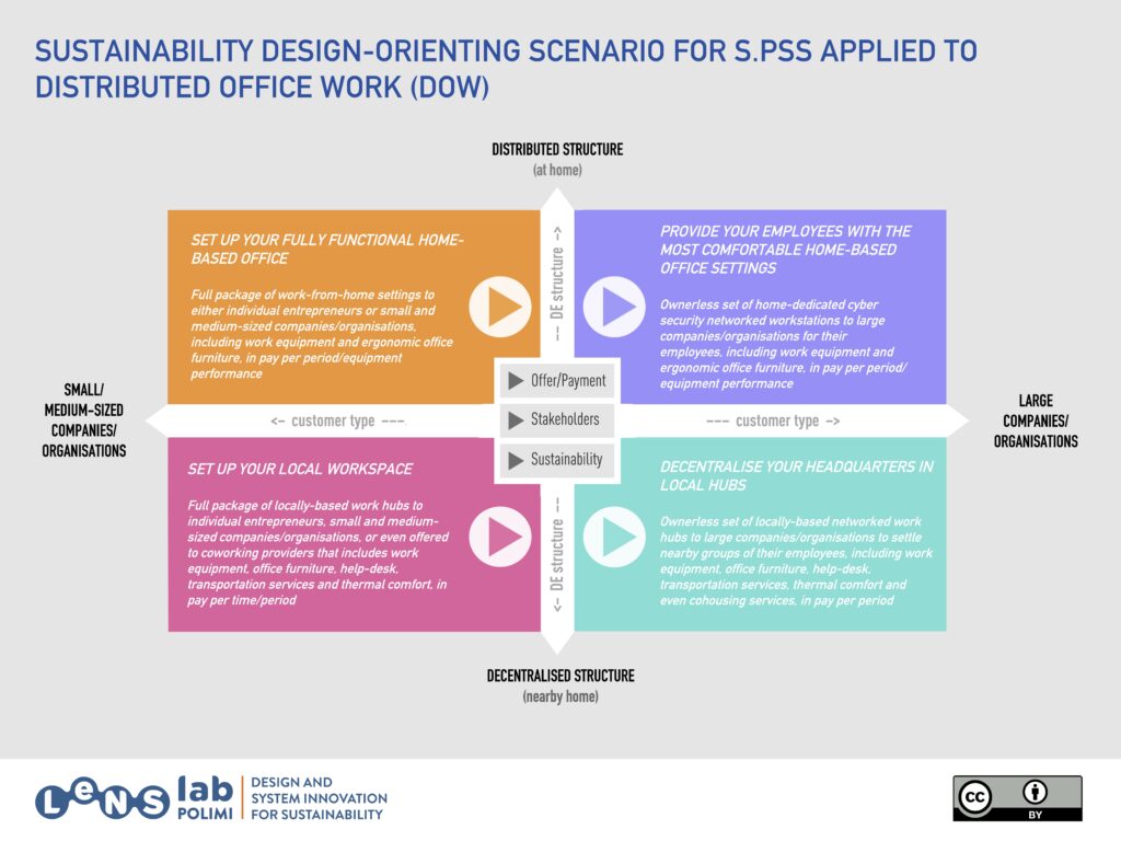Scenario (SDOS) for Sustainable Product-Service Systems (S.PSS) applied to Distributed Office Work (DOW) is an open-access tool developed as a master thesis project by Banghan Yin as a master thesis project, tutored by Carlo Vezzoli of LeNSlab Polimi. Its objective is to orient the design process towards sustainable system solutions for office work by using immersive and inspiring scenario videos to stimulate the generation of S.PSS applied to DOW ideas.