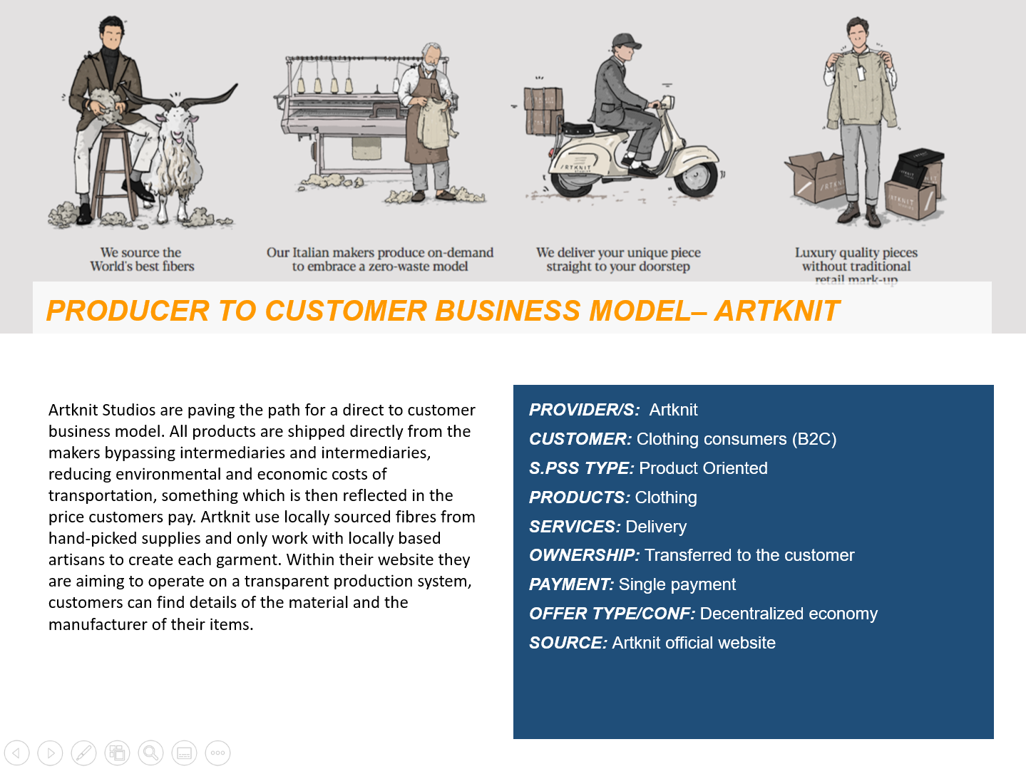 - Clothing developer/designer creates partnerships with clothing manufacturers for local delivery (e.g. a decentralised manufacturers network) Producer to customer business model – Artknit