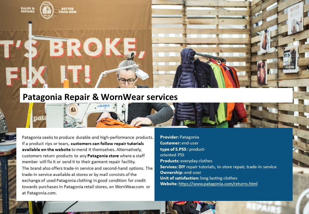 - Clothing producer/provider uses digital channels to offer information/guidance services for clothing purchase and care, e.g. virtual fitting rooms, repair and care instructions Repair & WornWear services – Patagonia