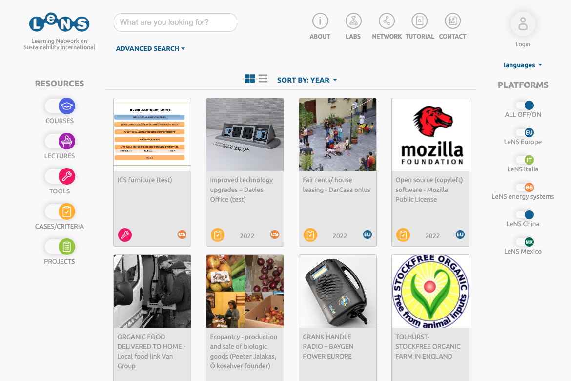 Learning resources are provided by members of the LeNS Network and include courses, lectures, tools, guides, case studies and projects related to sustainability. The network expects the knowledge to be fully utilized and to support Design for Sustainability (DfS) research, education and practice.
